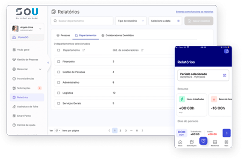 Gere relatórios fiscais como Espelho de Ponto e Banco de Horas em segundos. Com a SOU, você economiza tempo e evita erros no fechamento da folha.